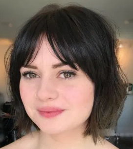 浓密头发在头尾处分层,将可爱的圆形形状传达给她的撇肩式短发。她选择用长满刘海的刘海把它弄得凌乱。