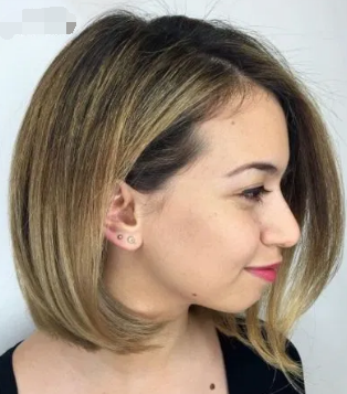并非所有的圆脸女人都超重!有时,您会遇到一个瘦削的女孩,有着可爱的圆脸。下巴长度不连贯的下巴凸显颈部,淡化丰满感,使脸部显得过宽。一侧耳朵后面有一两个或两个锁的侧面部件,使外观保持休闲和俏皮。