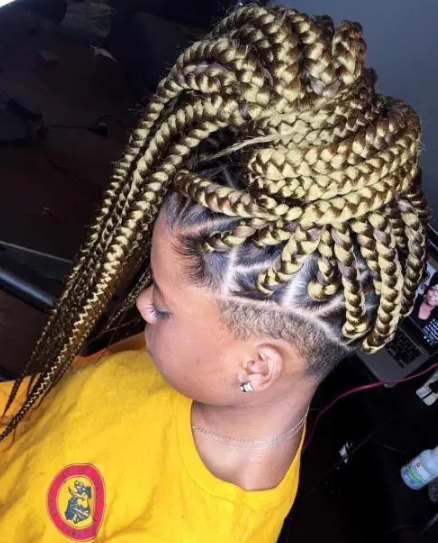 用盒子辫子做出剃光的一面很困难!您必须确保它确实是您想要的样式。如果没有,您会发现自己很难摆脱嗡嗡的一面。完整的嗡嗡声的一个很好的替代方法是耳朵上方的小部分。这给了您一些底切的细节,如果您决定不适合自己,这些细节仍然可以隐藏。