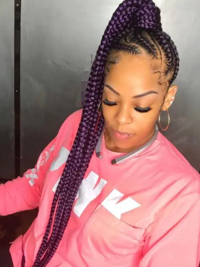 标准形式侧扫样式的一个有趣变化是柠檬水辫状的马尾辫,在此以深金属紫色制成。小而细的辫子穿插在厚而弯曲的辫子之间,这些辫子变成异想天开的花冠,长发辫从发the的中心发芽。
