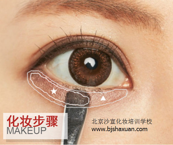 step 1:用眼影刷沾取棕色眼影,大面积扫在眼眶上,大约占眉毛到眼睛的二分之一,可以多刷几次,加强棕色效果。