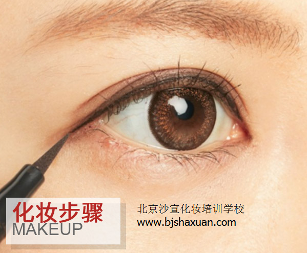 step 3:选取一支黑色眼线笔,顺着睫毛根部轻轻画,记住不要留睫毛根部的空隙,一直延伸到眼角伸出去大约5mm处。