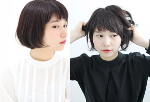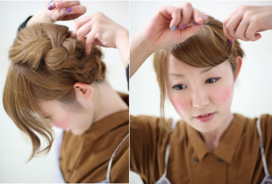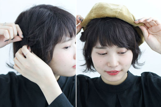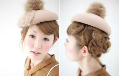 step 6:刘海梳理之后喷定型产品,发尾往内扭转固定,最后盖上帽子就完成了。