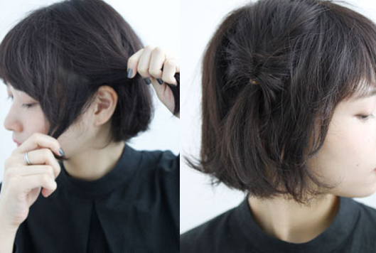 step 4:用橡皮筋固定头发,然后翻转一下。另一侧也做同样的操作。