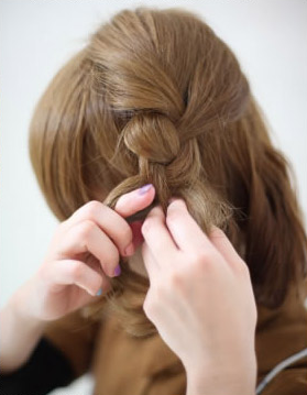 step 5:用辫子遮盖住扭转发束发尾,用发卡辅助固定。