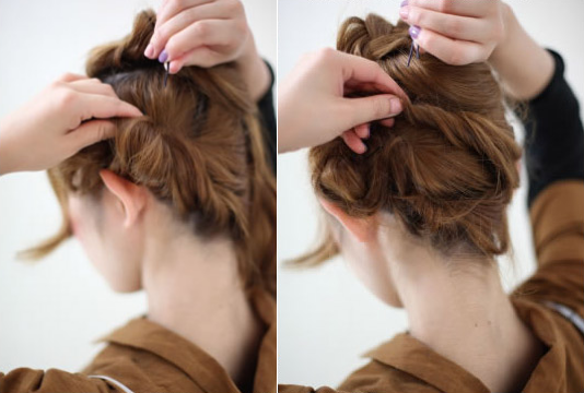 step 4:右侧的头发集中在一起,往左侧扭转,用发卡固定在编发下方。