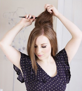把耳朵上方的头发像图中这样往上方卷,一直卷到后边发型中间的位置并固定;