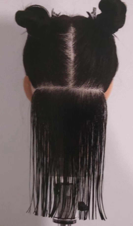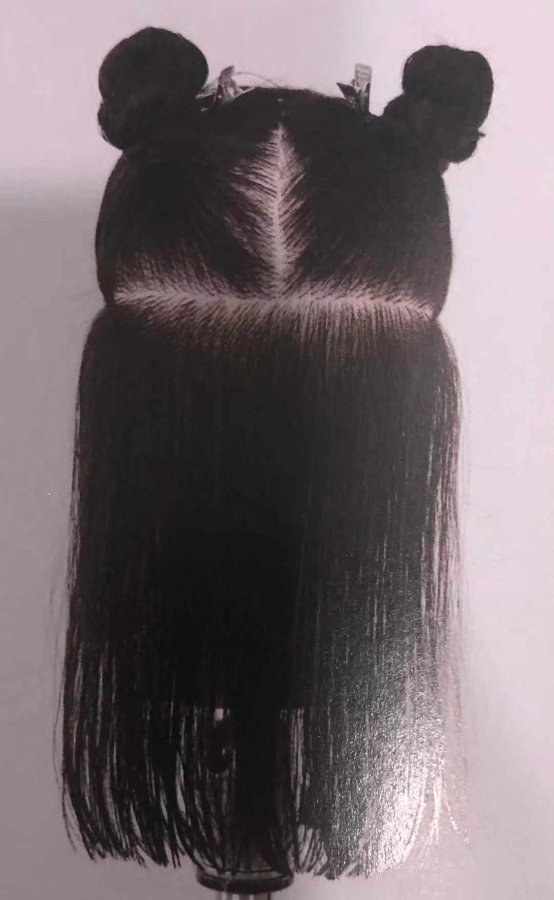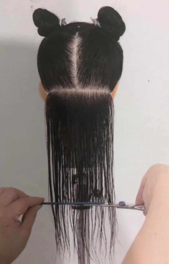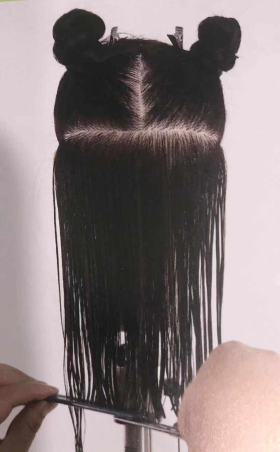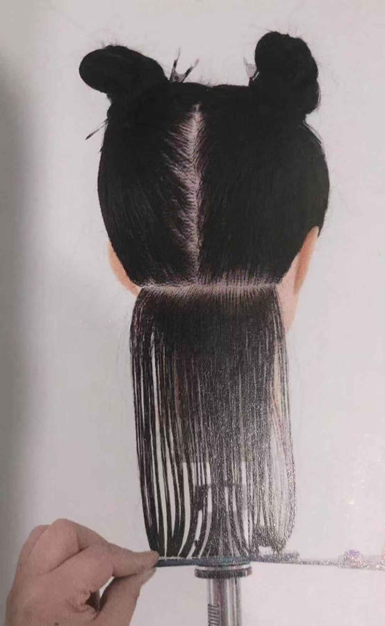 1. 将所有头发沿中轴线分开,第一区分界线与地面水平。