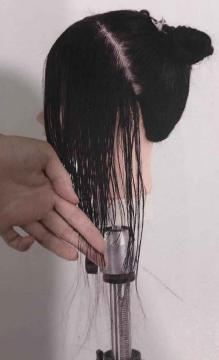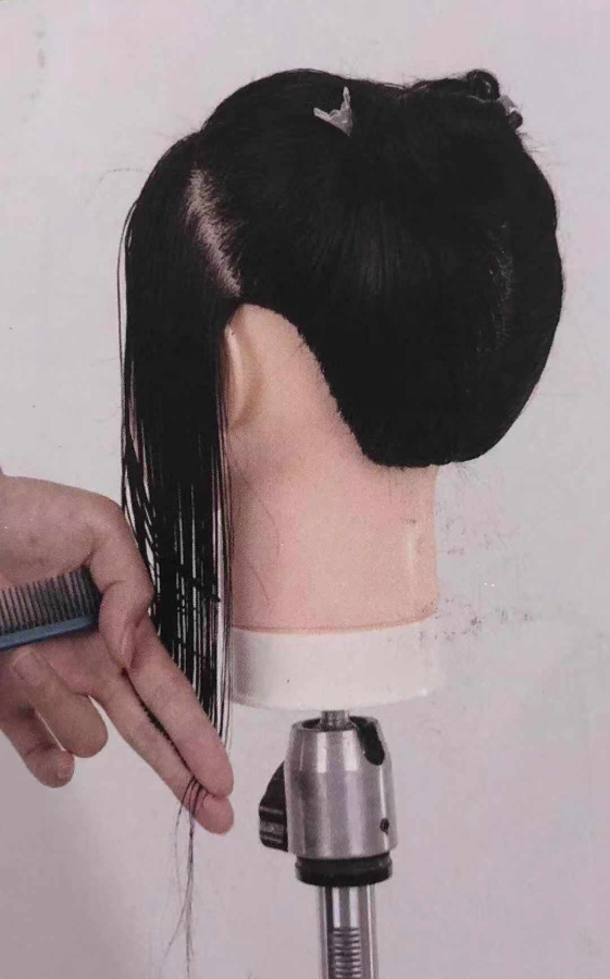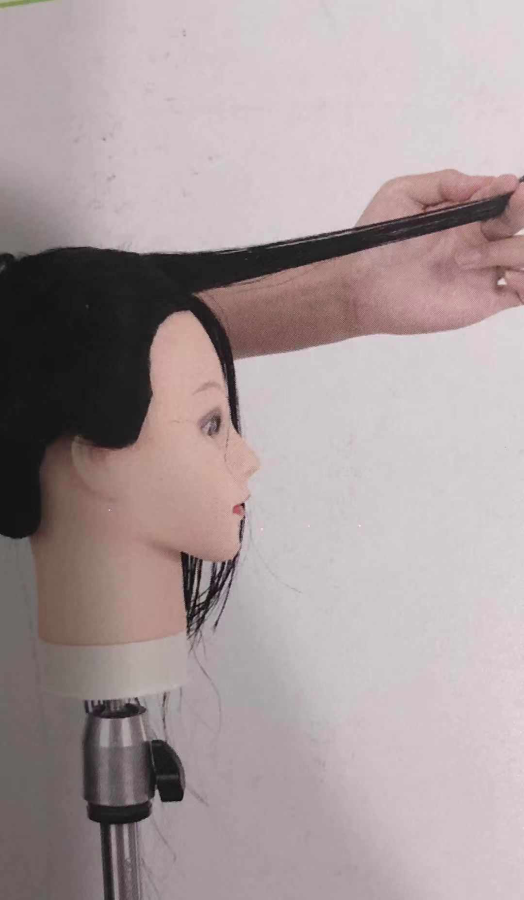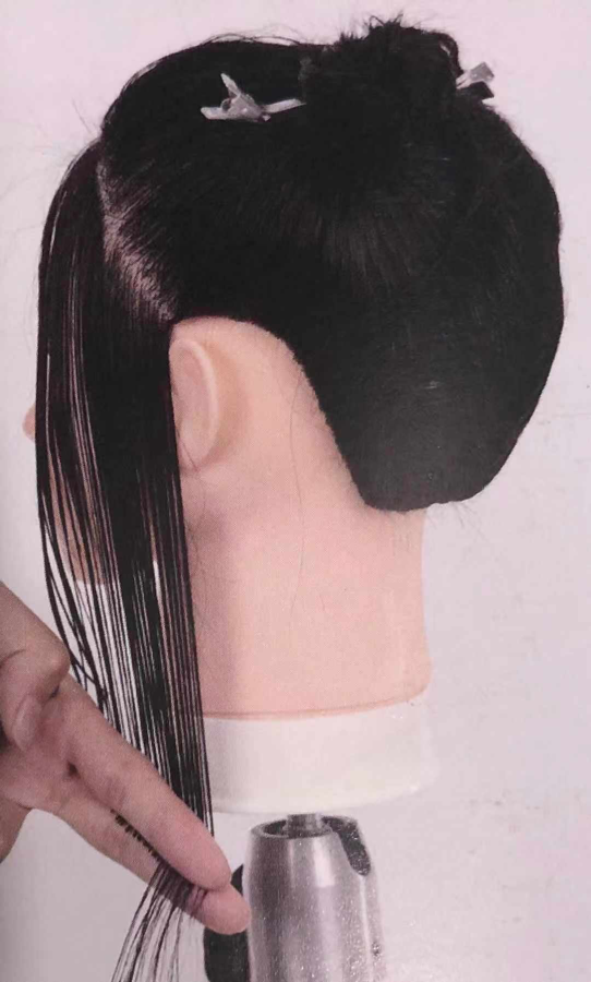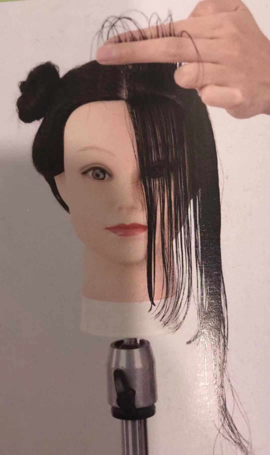 5. 取第2片发片,与地面保持30°夹角,水平提拉修剪。