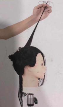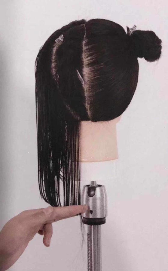 18.取第6片发片80°提拉修剪,手位逐渐向后。