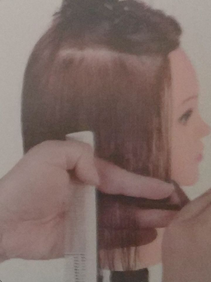 将左发区的最后一个发片取下,用梳子梳顺头发后按照导线进行修剪,注意切口保持水平