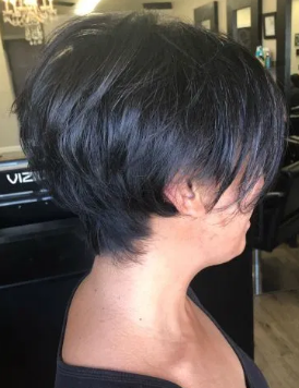 深棕色或黑色头发上的蓝色釉是为仍然安全的颜色增加一些尺寸和乐趣的好方法。对于浓密的头发,重要的是,您的剪裁在纯色深色中切勿显得块状,这就是为什么蓝色调和高光泽度效果对于这款小精灵短发效果如此之好。细腻的图层肯定会增强外观。